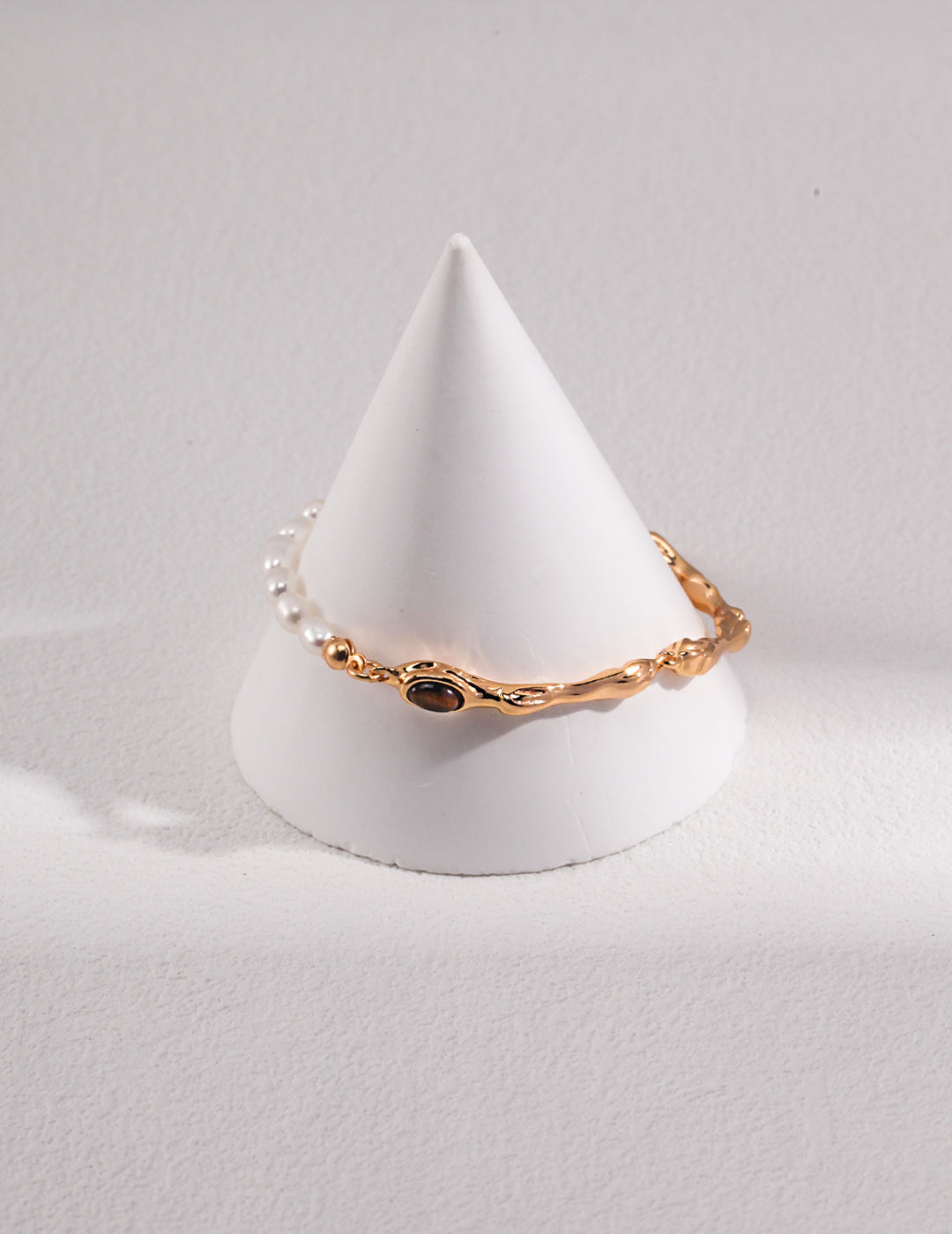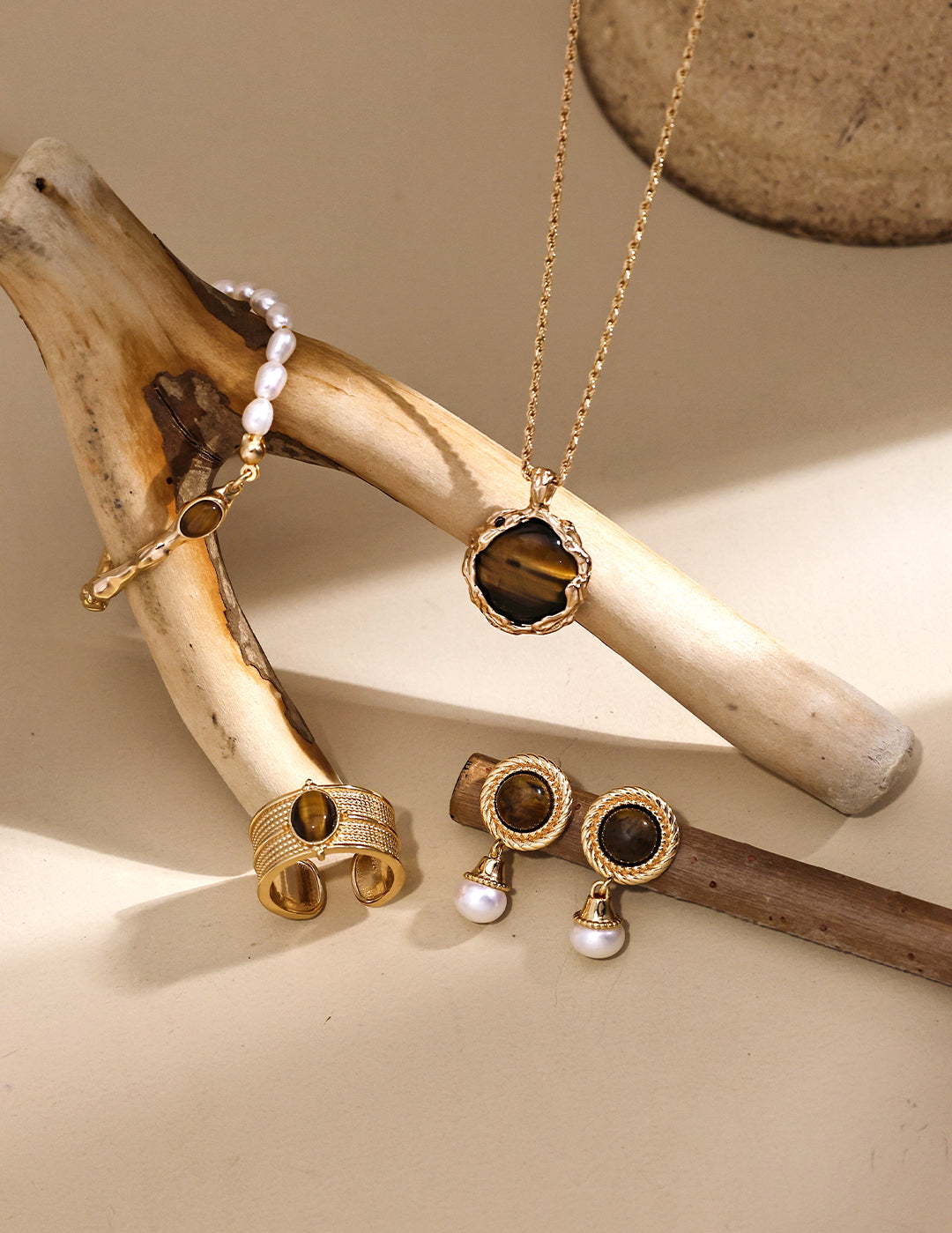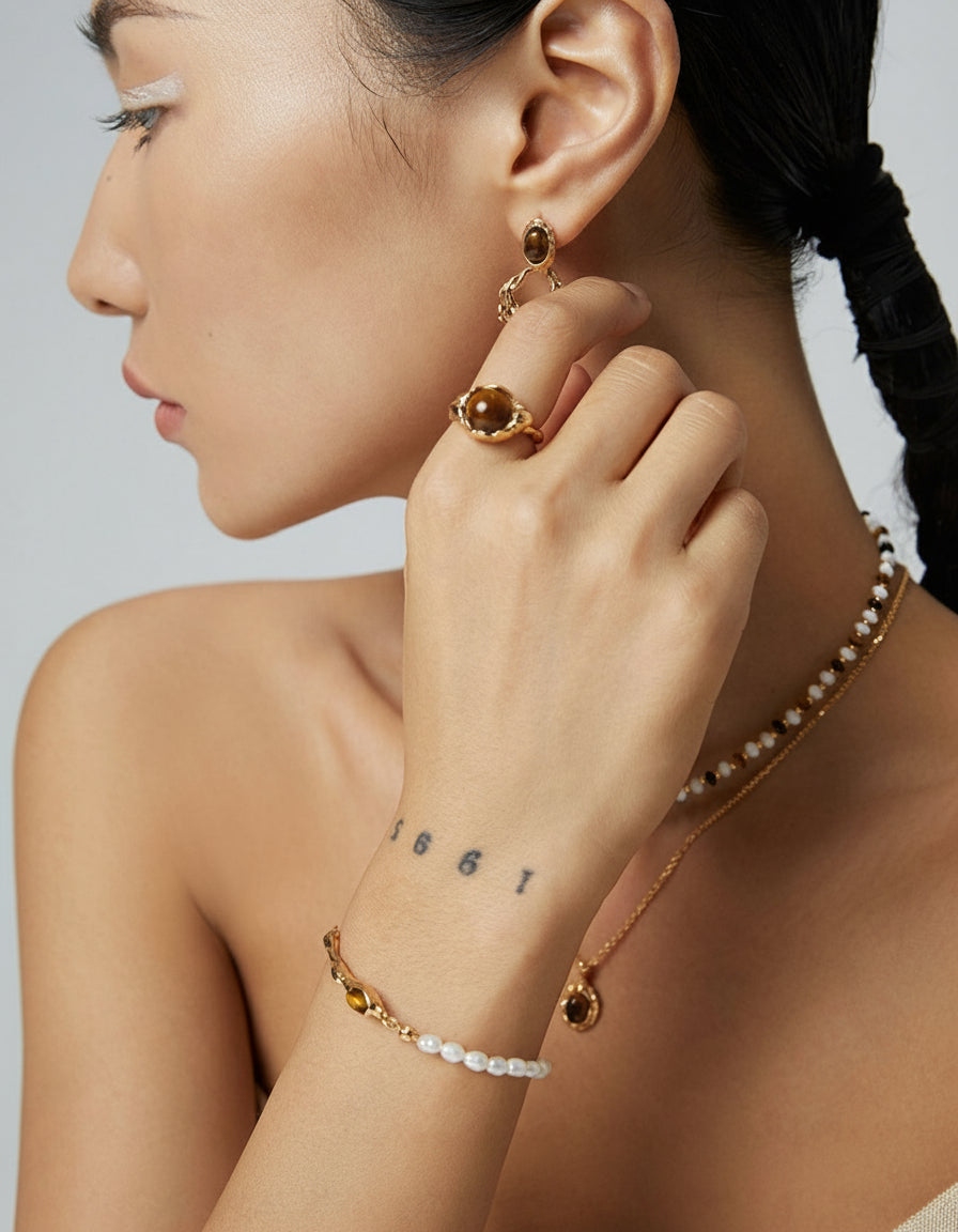 Midnight Ember Bracelet Striking tigerite stones bring warm, earthy tones to this elegant bracelet, paired with lustrous pearls for a touch of timeless sophistication. The natural striping of tigerite creates a mesmerizing depth, while creamy pearls add a soft contrast that catches the light beautifully. Perfect for layering or wearing solo, this piece transitions effortlessly from day to night. A versatile accessory that celebrates the beauty of natural gemstones and classic elegance.