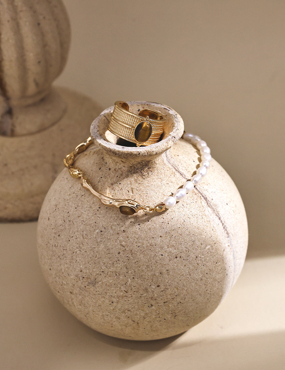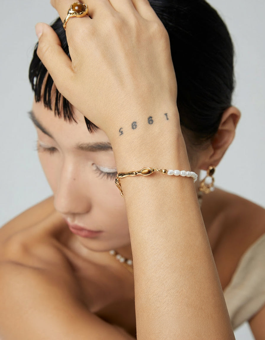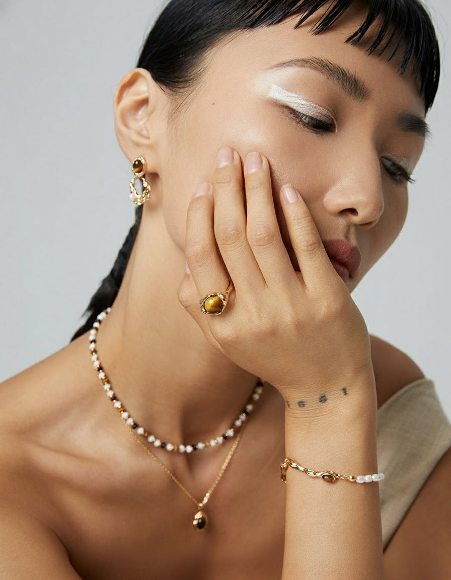 Midnight Ember Bracelet Striking tigerite stones bring warm, earthy tones to this elegant bracelet, paired with lustrous pearls for a touch of timeless sophistication. The natural striping of tigerite creates a mesmerizing depth, while creamy pearls add a soft contrast that catches the light beautifully. Perfect for layering or wearing solo, this piece transitions effortlessly from day to night. A versatile accessory that celebrates the beauty of natural gemstones and classic elegance.