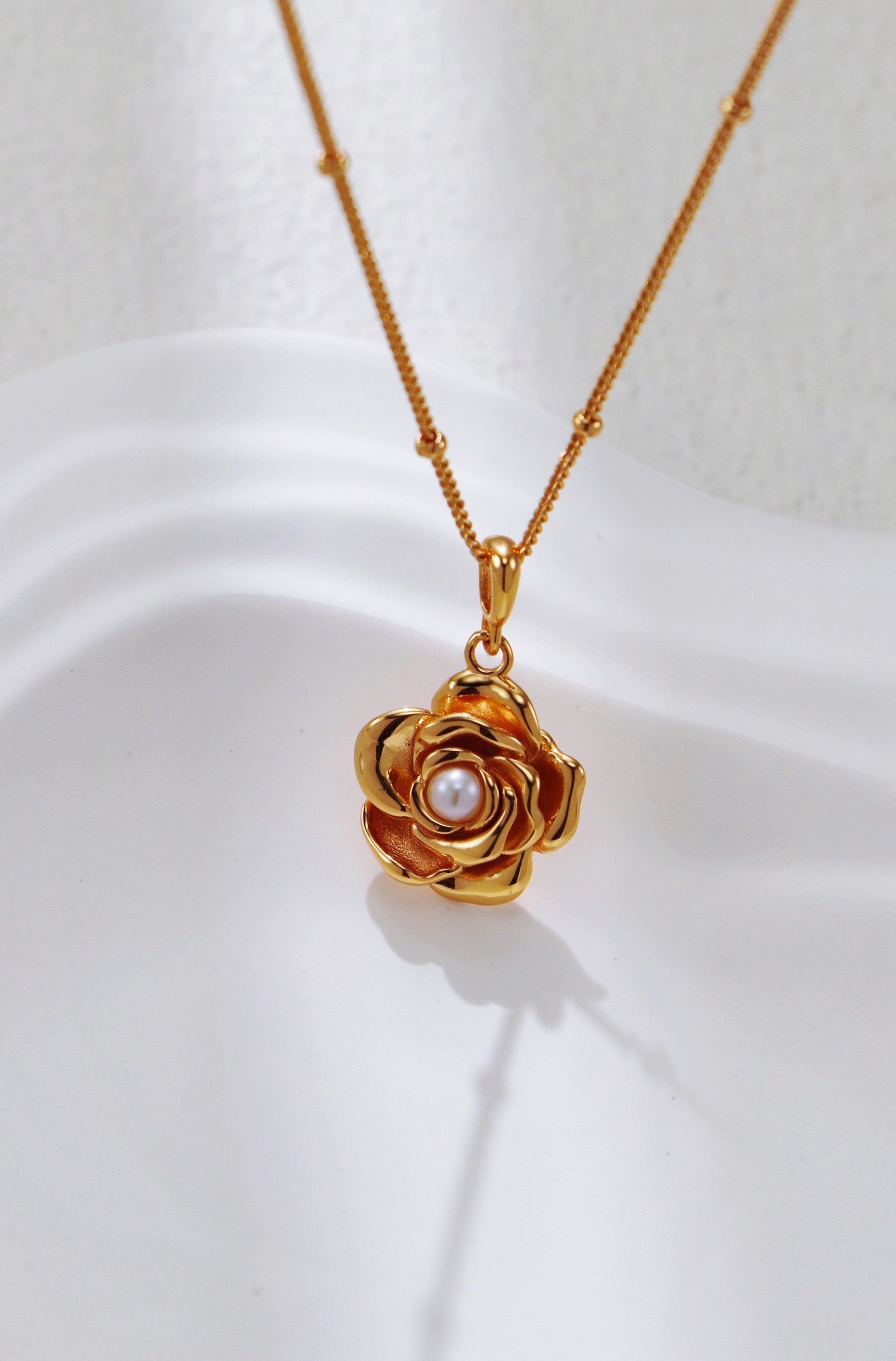 Delicate rose pendant meets timeless elegance with this charming necklace. The intricately sculpted rose blooms in lustrous detail, suspended from a simple golden chain that lets the focal point shine. Perfect for everyday wear or layering, this piece adds a touch of romantic sophistication to any outfit. Whether you're dressing up or keeping it casual, this versatile necklace brings effortless grace to your jewelry collection.