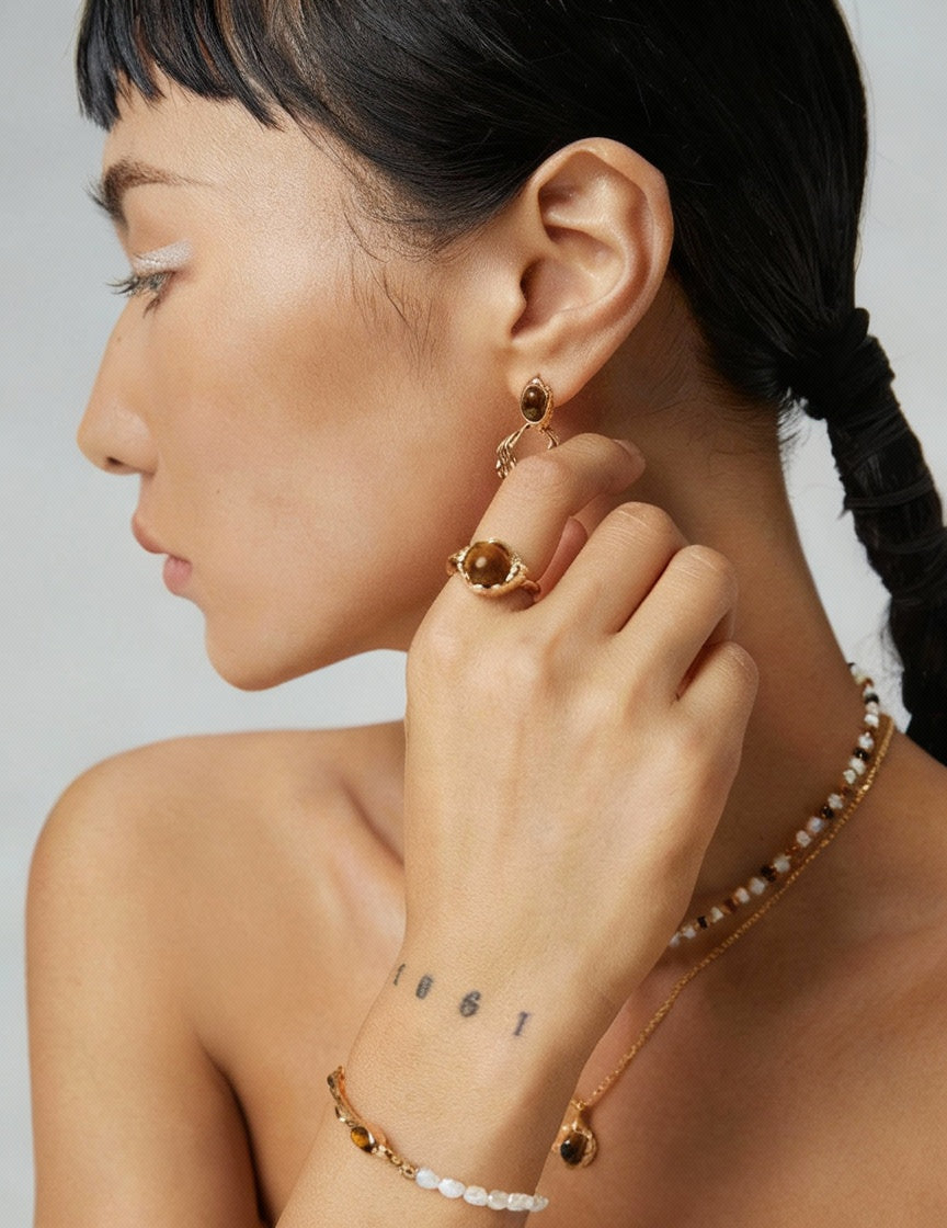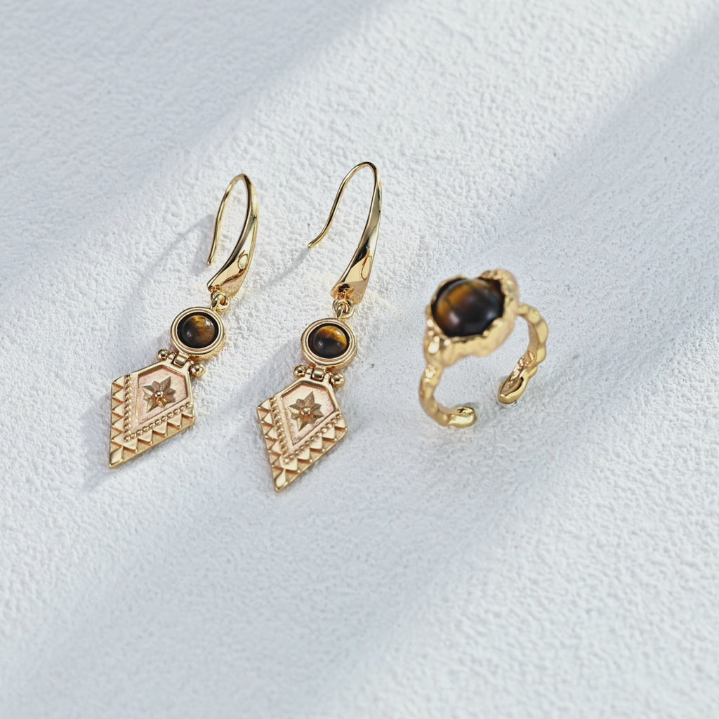 Midnight Ember Ring features a striking combination of warm gold tones and rich tigerite stone, creating an eye-catching piece that works with any style. The adjustable sizing (10-15) ensures a perfect fit for most wearers, making it a versatile addition to your jewelry collection. Whether you're dressing up or keeping it casual, this ring brings just the right amount of edge and elegance to your everyday look.